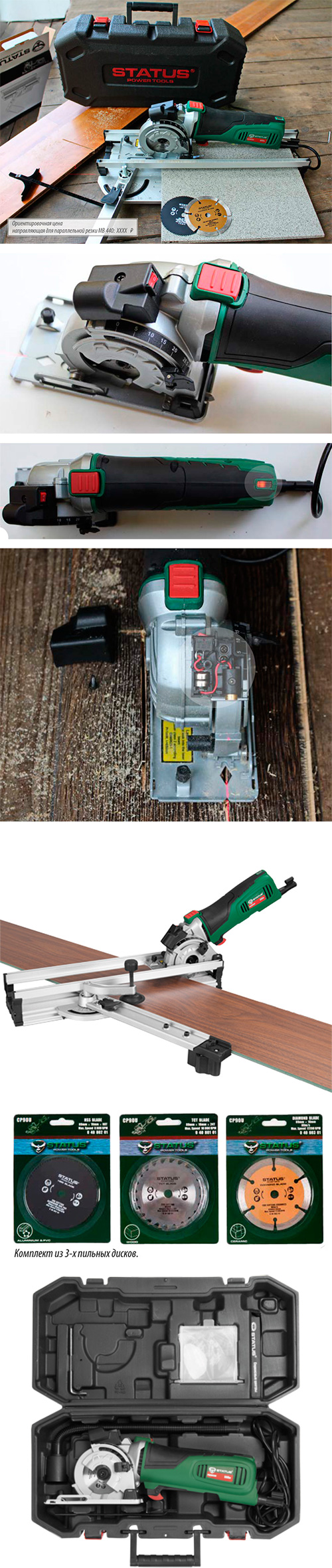 Производитель изначально спроектировал данную дисковую пилу для наиболее распространенных видов пиления. Чтобы протестировать пилу в действии, лучше всего использовать направляющую для параллельной резки от этого же производителя STATUS MB 440.